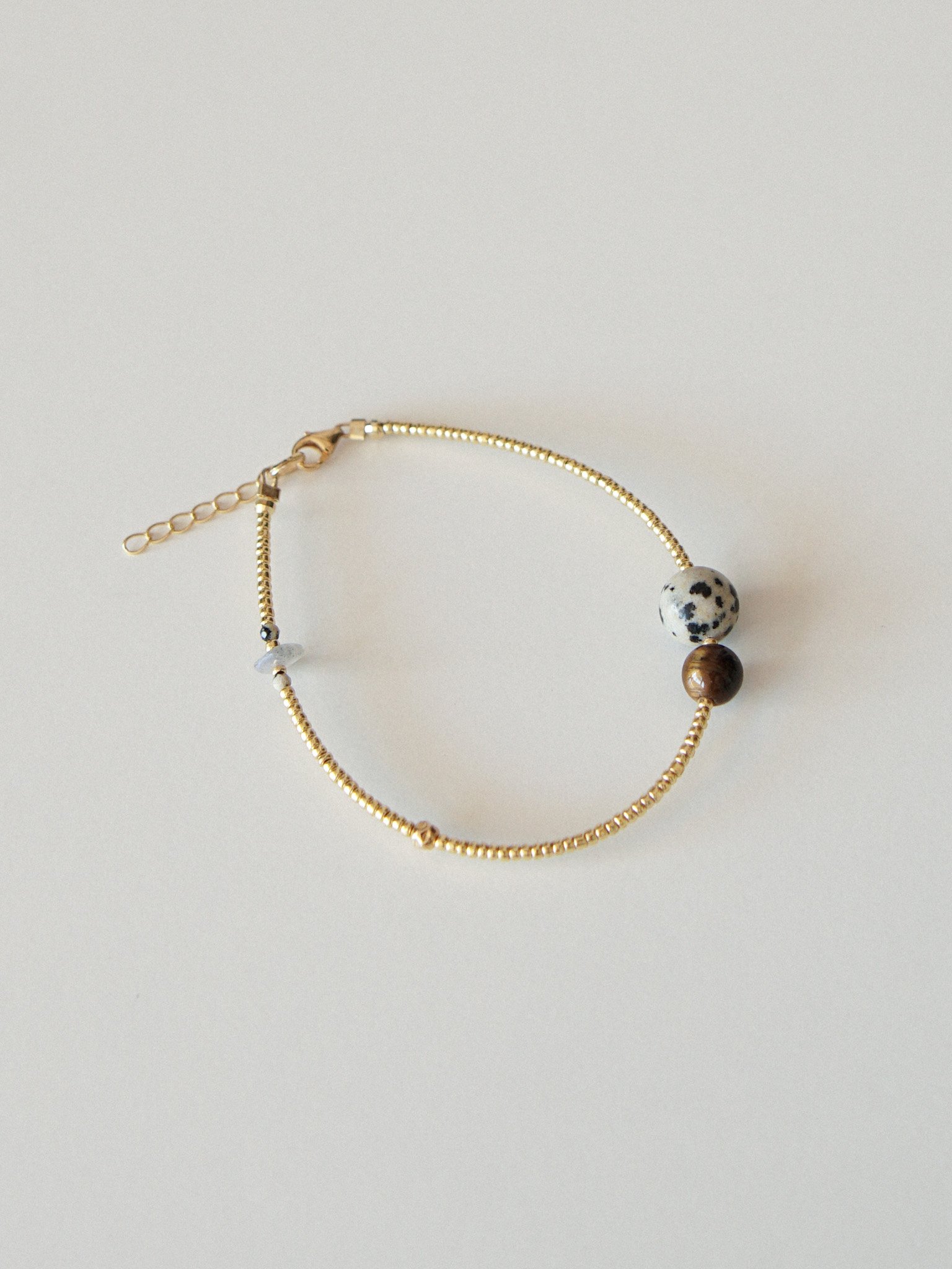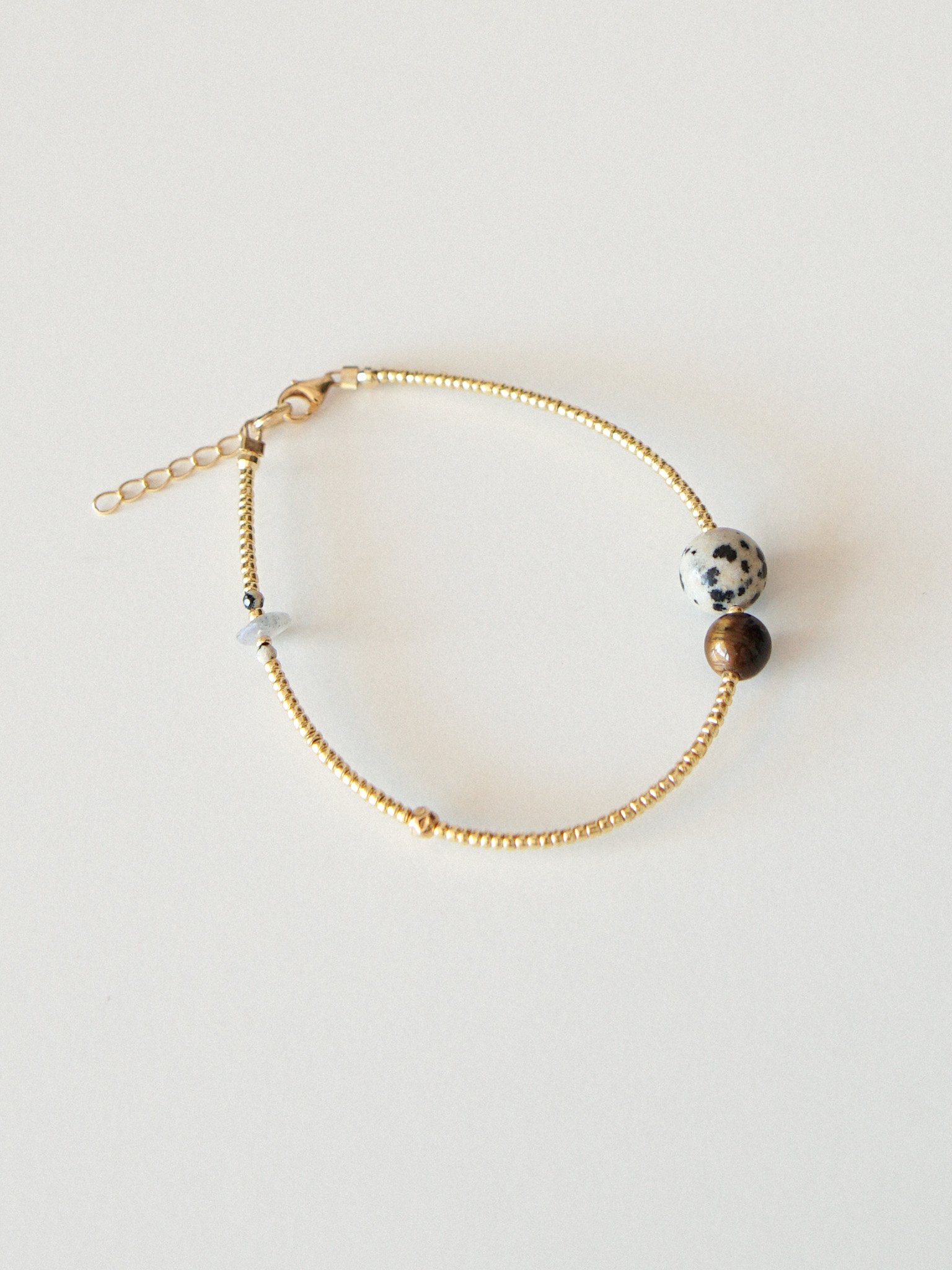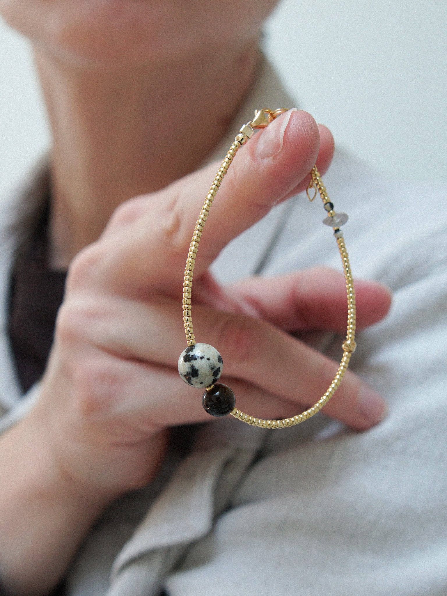 ORBITA to bransoletka wykonana ręcznie z drobnych koralików szklanych w kolorze złotym. W koraliki są wplecione kamienie naturalne – dwie gładkie kulki jaspisu i agatu, dwa malutkie fasetowane koraliki jaspisu i nieregularny, opalizujący labradoryt oraz koralik srebra pozłacanego. Bransoletka posiada zapięcie ze srebra pozłacanego wraz z przedłużką do regulacji długości.