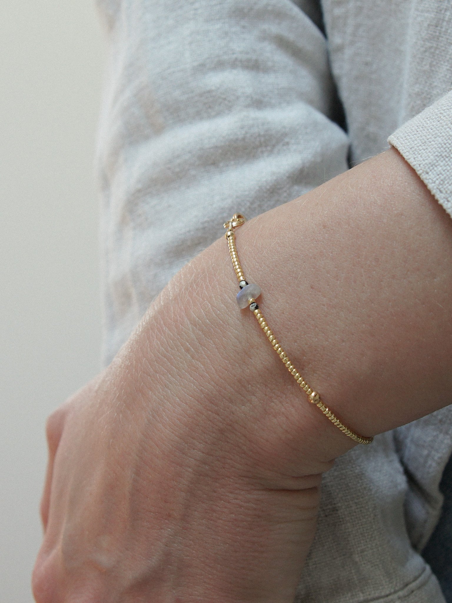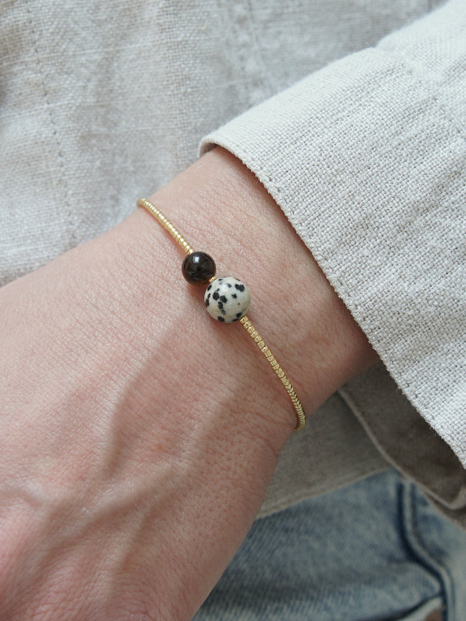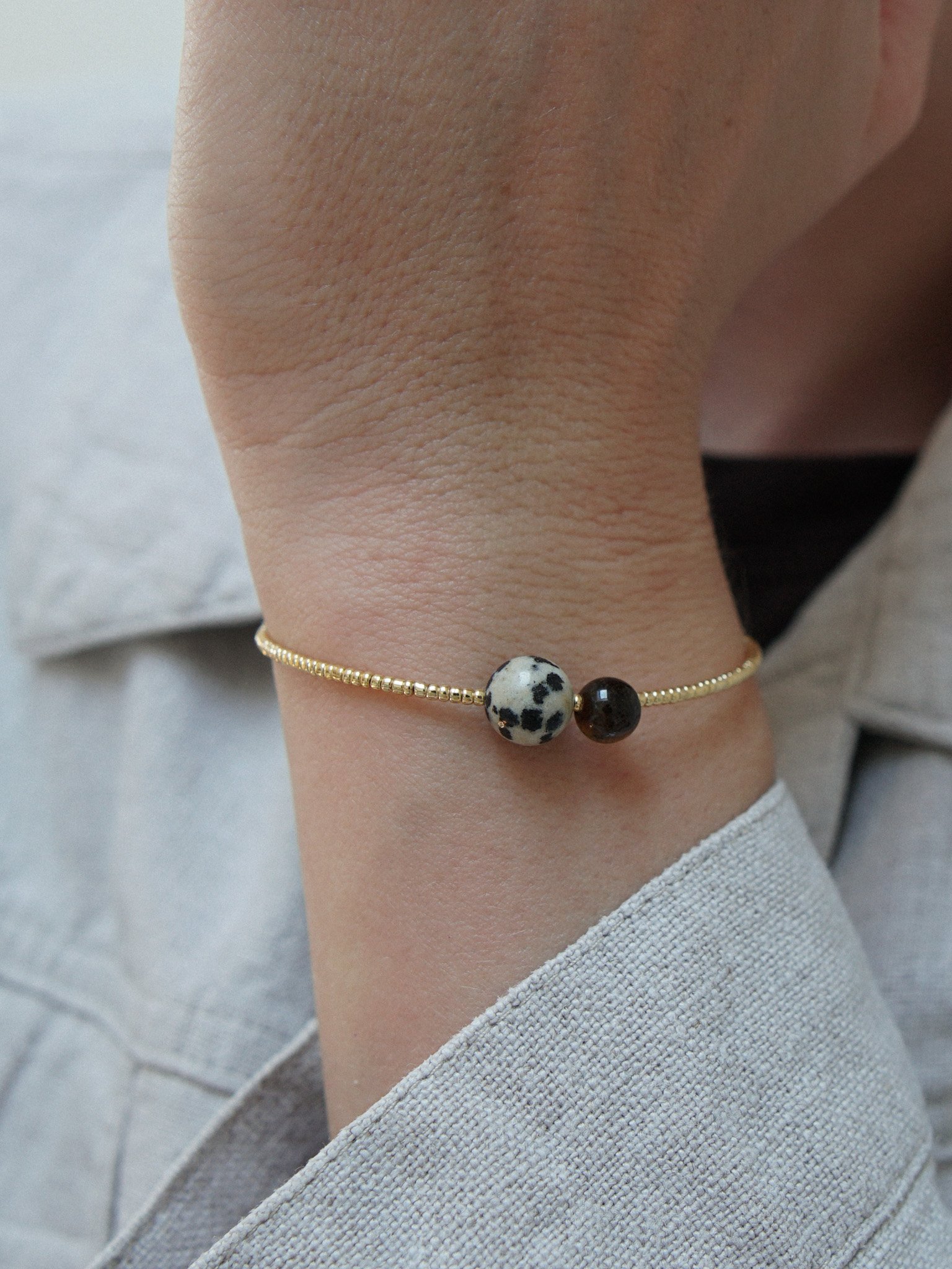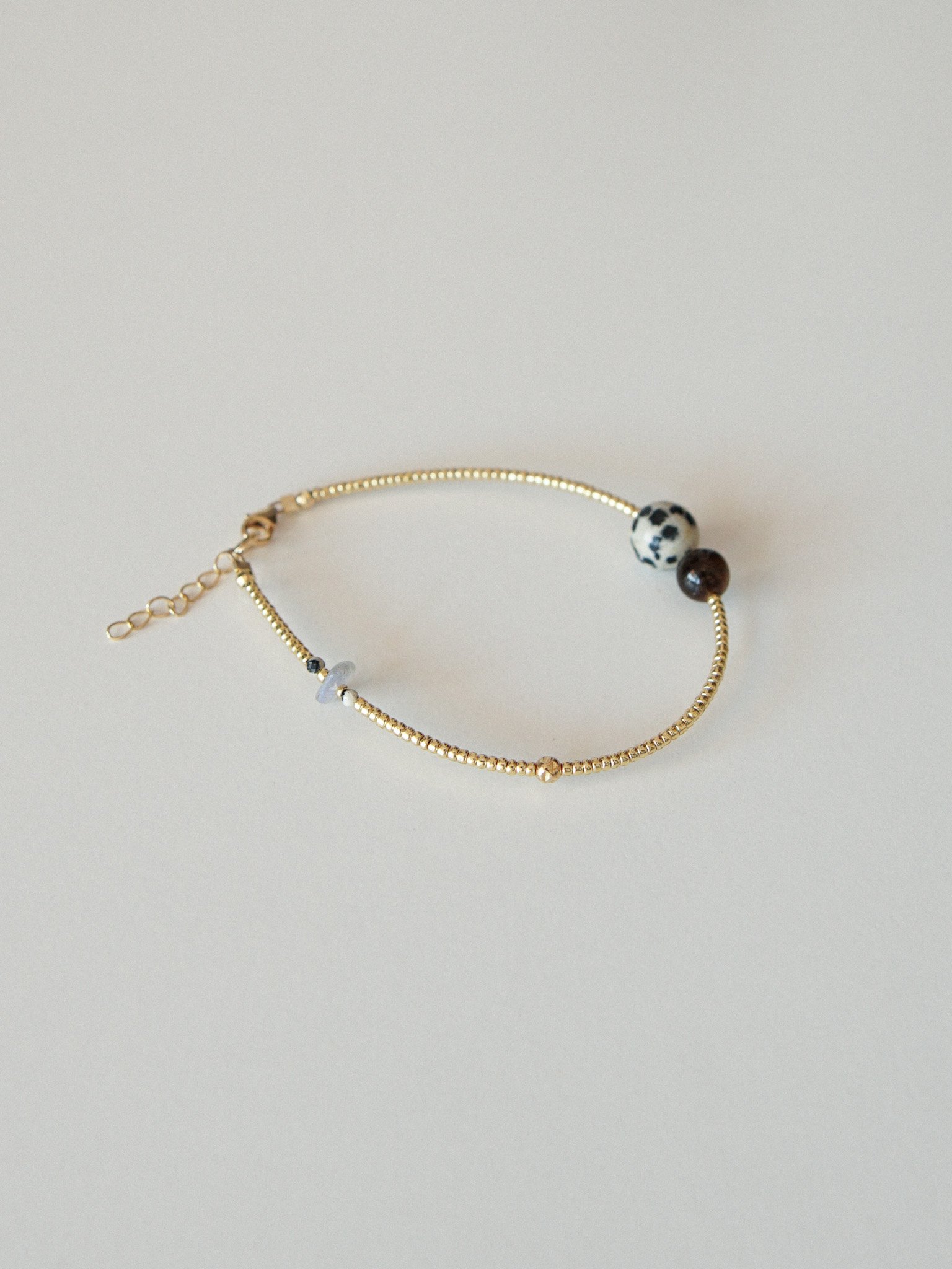 ORBITA to bransoletka wykonana ręcznie z drobnych koralików szklanych w kolorze złotym. W koraliki są wplecione kamienie naturalne – dwie gładkie kulki jaspisu i agatu, dwa malutkie fasetowane koraliki jaspisu i nieregularny, opalizujący labradoryt oraz koralik srebra pozłacanego. Bransoletka posiada zapięcie ze srebra pozłacanego wraz z przedłużką do regulacji długości.