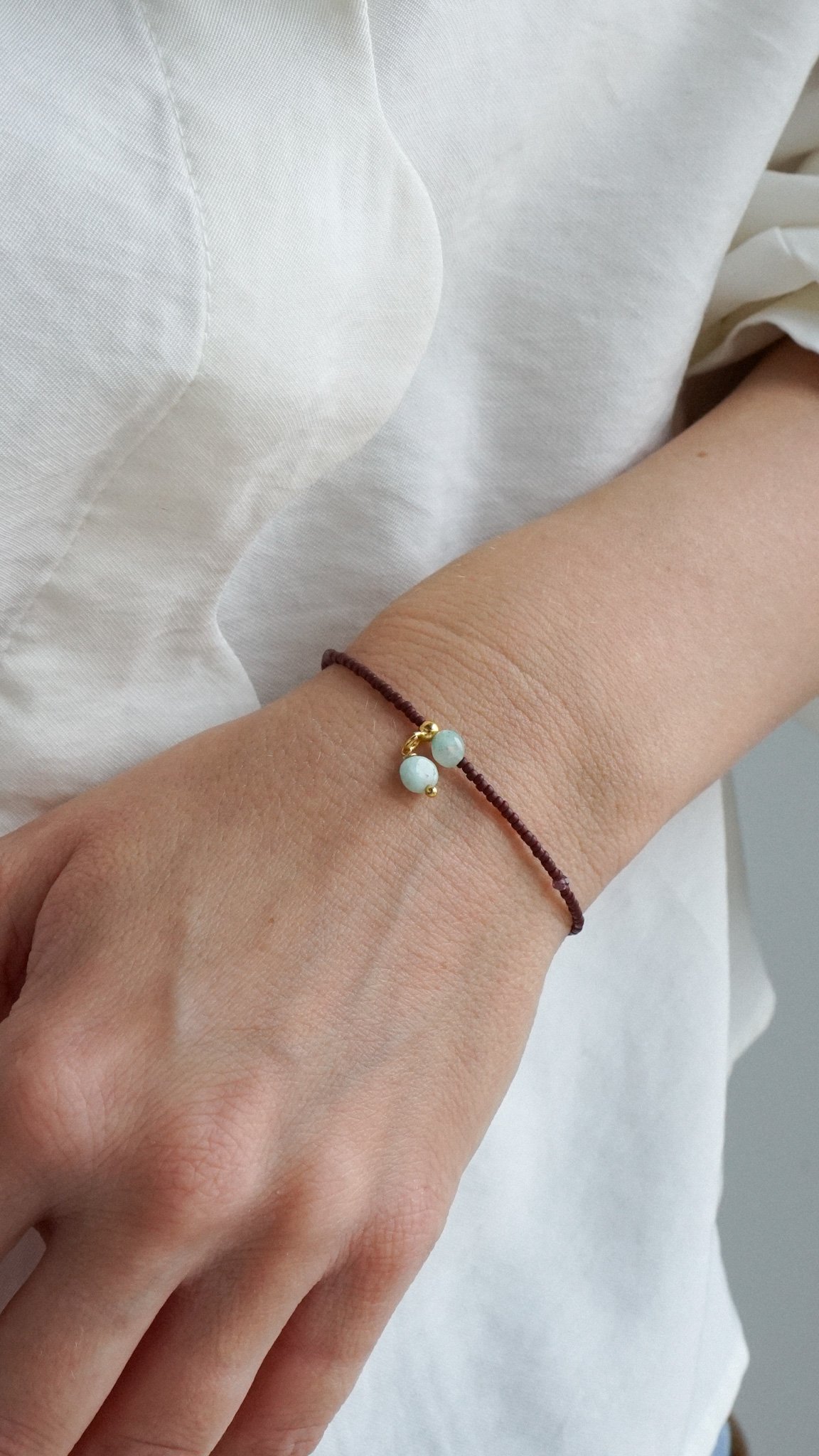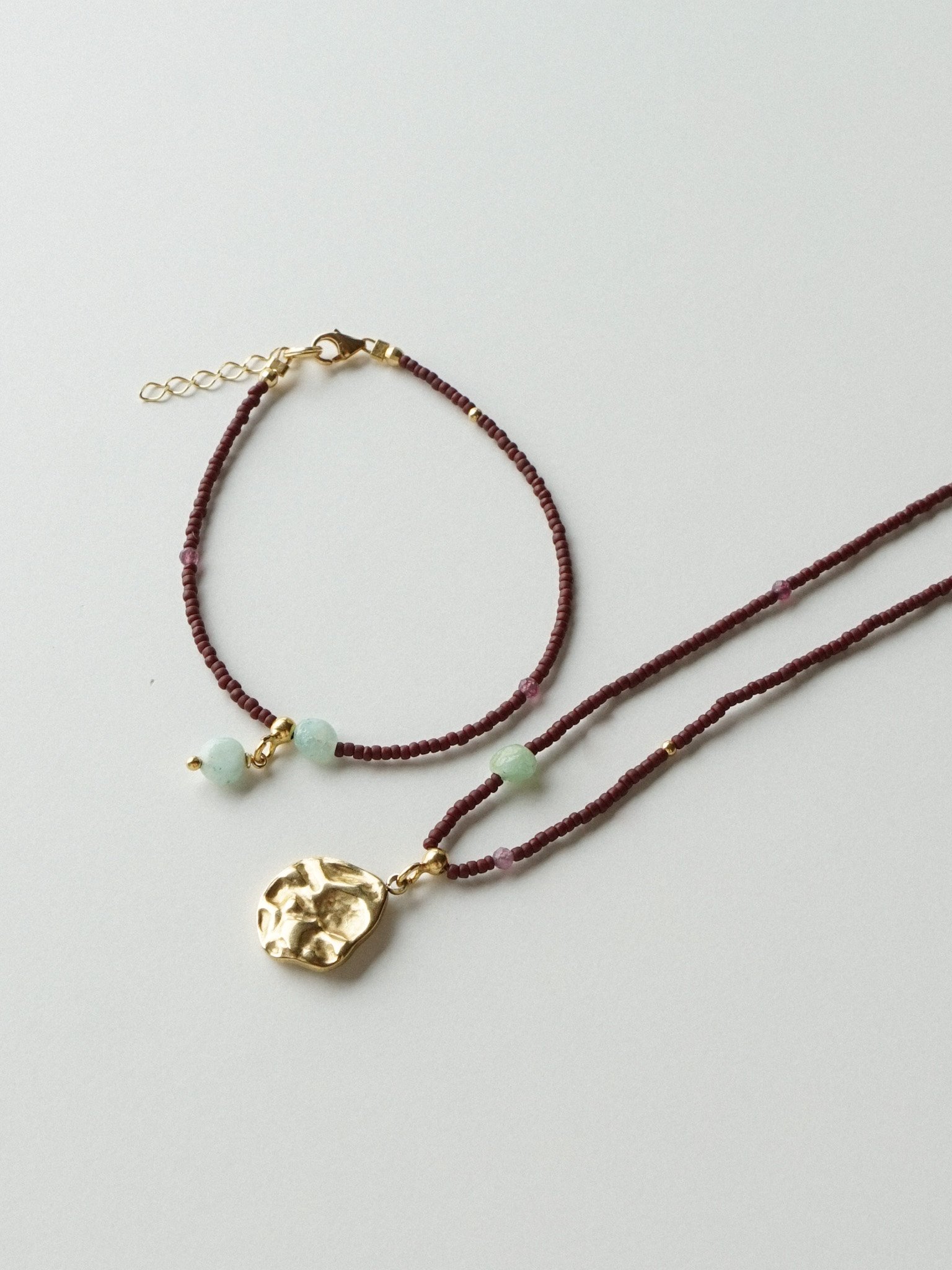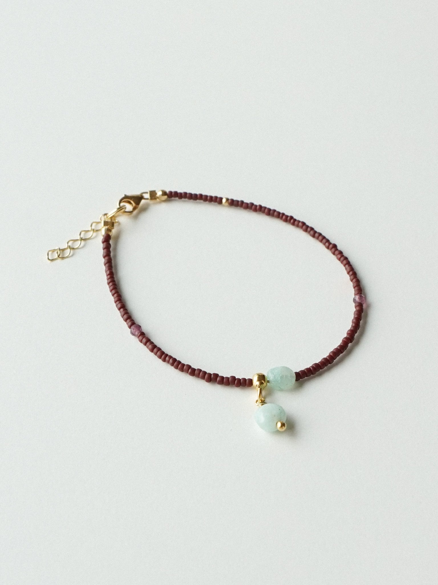 Bransoletka wykonana ręcznie z drobnych koralików szklanych w kolorze burgundowym. Posiada zawieszkę w postaci nieregularnego amazonitu. Niewielkie, fasetowane ametysty, podobnie jak drugi amazonit oraz kuleczka srebra pozłacanego są wkomponowane w koraliki szklane. Bransoletka ma zapięcie i przedłużkę ze srebra pozłacanego.