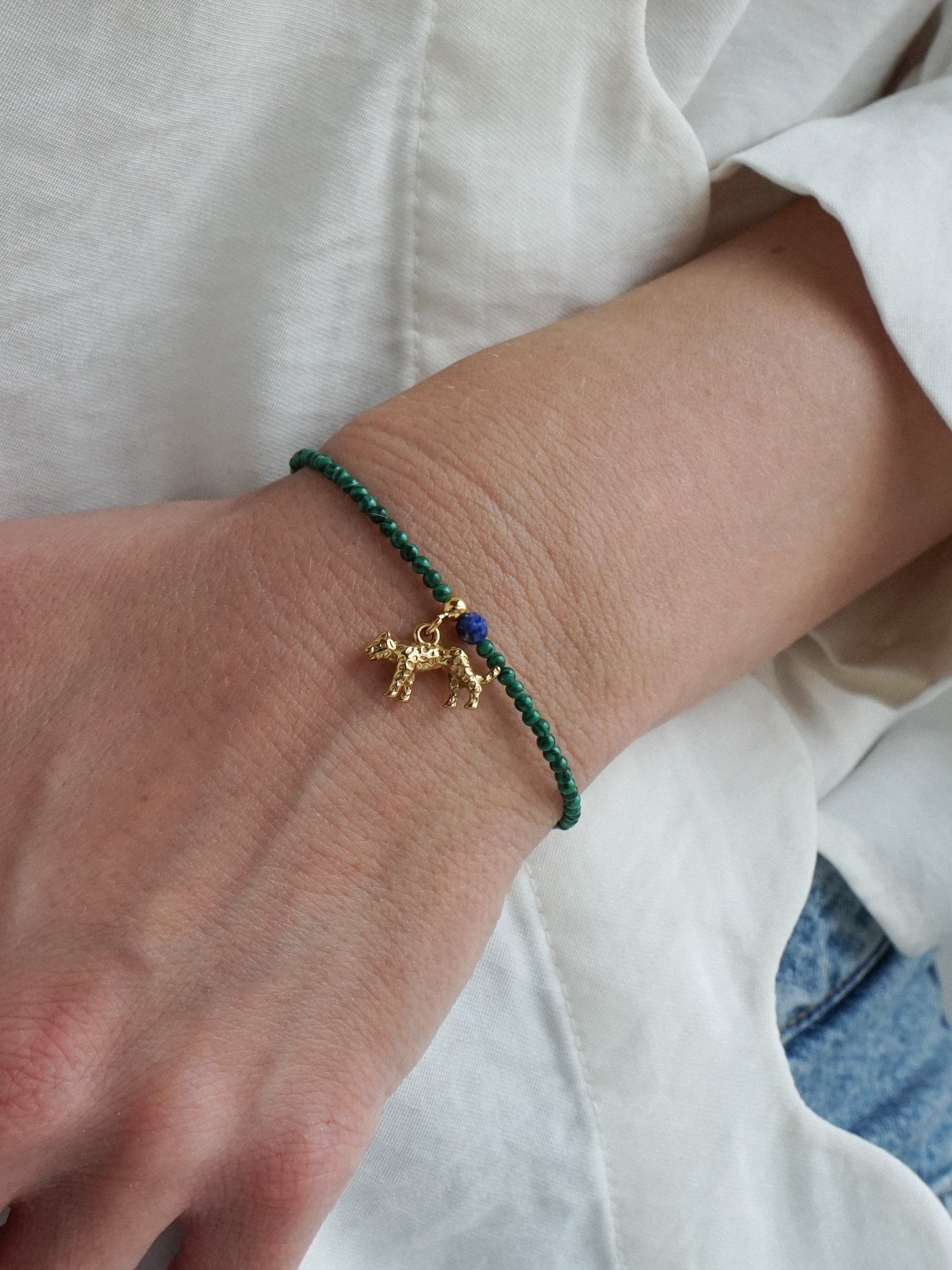 BRAZYLIA to bransoletka inspirowana podróżą do Brazylii i brazylijską naturą. Wykonana ręcznie z drobnych kamieni malachitu w kolorze butelkowej zieleni. Między malachit nawleczone są pojedyncze kamyki żółtego agatu i niebieskiego lapis lazuli. Zawieszka to jaguar – dziki kot charakterystyczny dla Brazylii. Zawieszka wykonana ze stali nierdzewnej. bransoletka posiada zapięcie i przedłużkę ze srebra pozłacanego. Z tą bransoletką możesz stworzyć komplet z naszyjnikiem o tej samej nazwie.