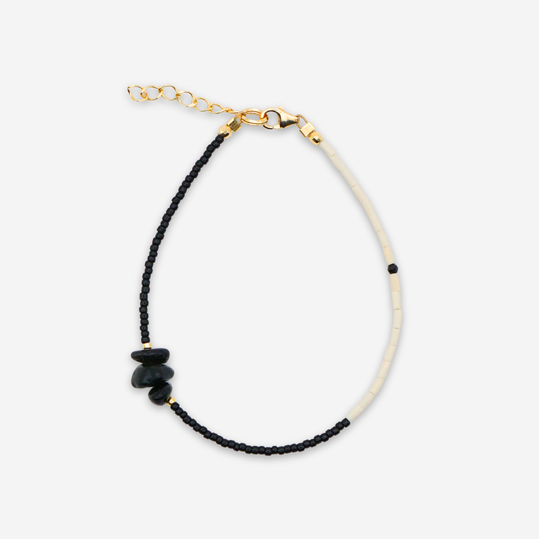 NOC POLRNA to wyjątkowa bransoletka łącząca dwie kontrastujące ze sobą barwy – czerń i beż. Jest wykonana z drobnych koralików szklanych oraz agatów w odcieniach czerni. Kamienie mają naturalne, nieregularne kształty. Dodatkową ozdobą jest malutki, czarny, fasetowany spinel, wpleciony w beżowe koraliki. Bransoletka zapinana jest na zapięcie ze srebra pozłacanego. Każda posiada przedłużkę do regulacji długości.