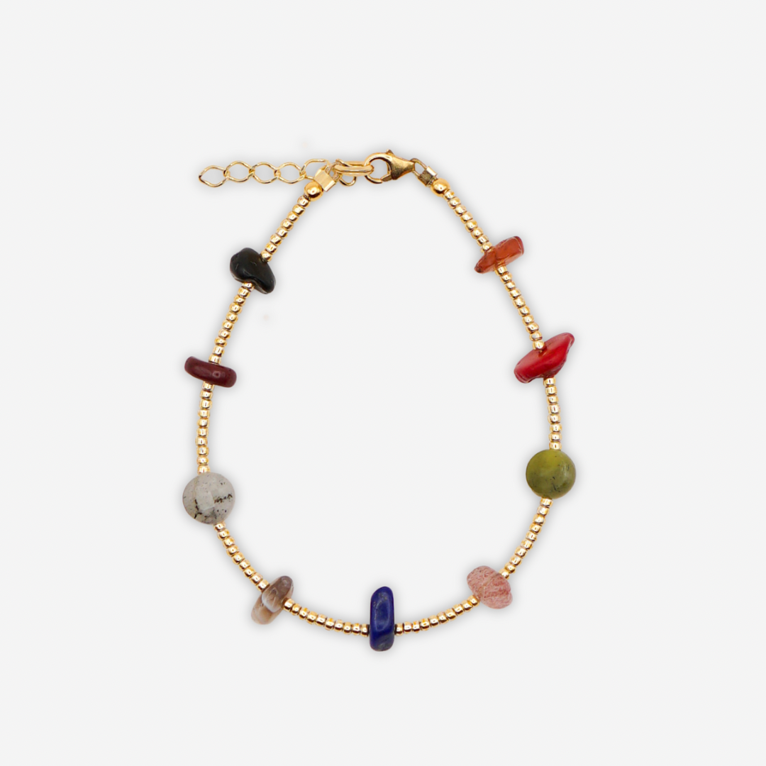 RUSAŁKA to fantazyjna bransoletka wykonana z koralików szklanych w kolorze złotym. Urzeka wielobarwnymi kamieniami naturalnymi i koralem w nieregularnych kształtach. Kamienie wykorzystane do wykonania bransoletki to: czarny agat, agat w odcieniach bordo i beżu szary labradoryt, brzoskwiniowo różowy kwarc, niebieski lapis lazuli, różowy kryształ górski, zielony labradoryt, czerwony koral i agat w odcieniach szarości i beżu. Zapięcie jest wykonane ze srebra pozłacanego. Każda bransoletka posiada przedłużkę do regulacji długosci.