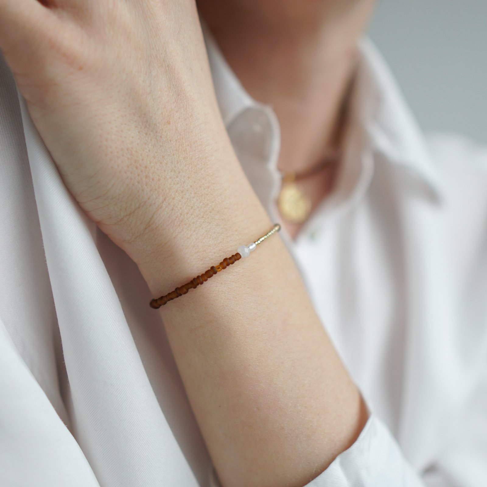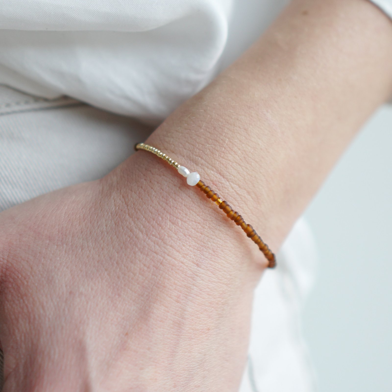 CYNAMON to bransoletka wykonany ręcznie z drobnych koralików szklanych w odcieniach cynamonowego brązu i złota, w koraliki wpleciony jest fasetowany, błyszczący biały kamień księżycowy i biała naturalna perła. Naszyjnik posiada zapięcie ze srebra pozłacanego wraz z przedłużką do regulacji długości.