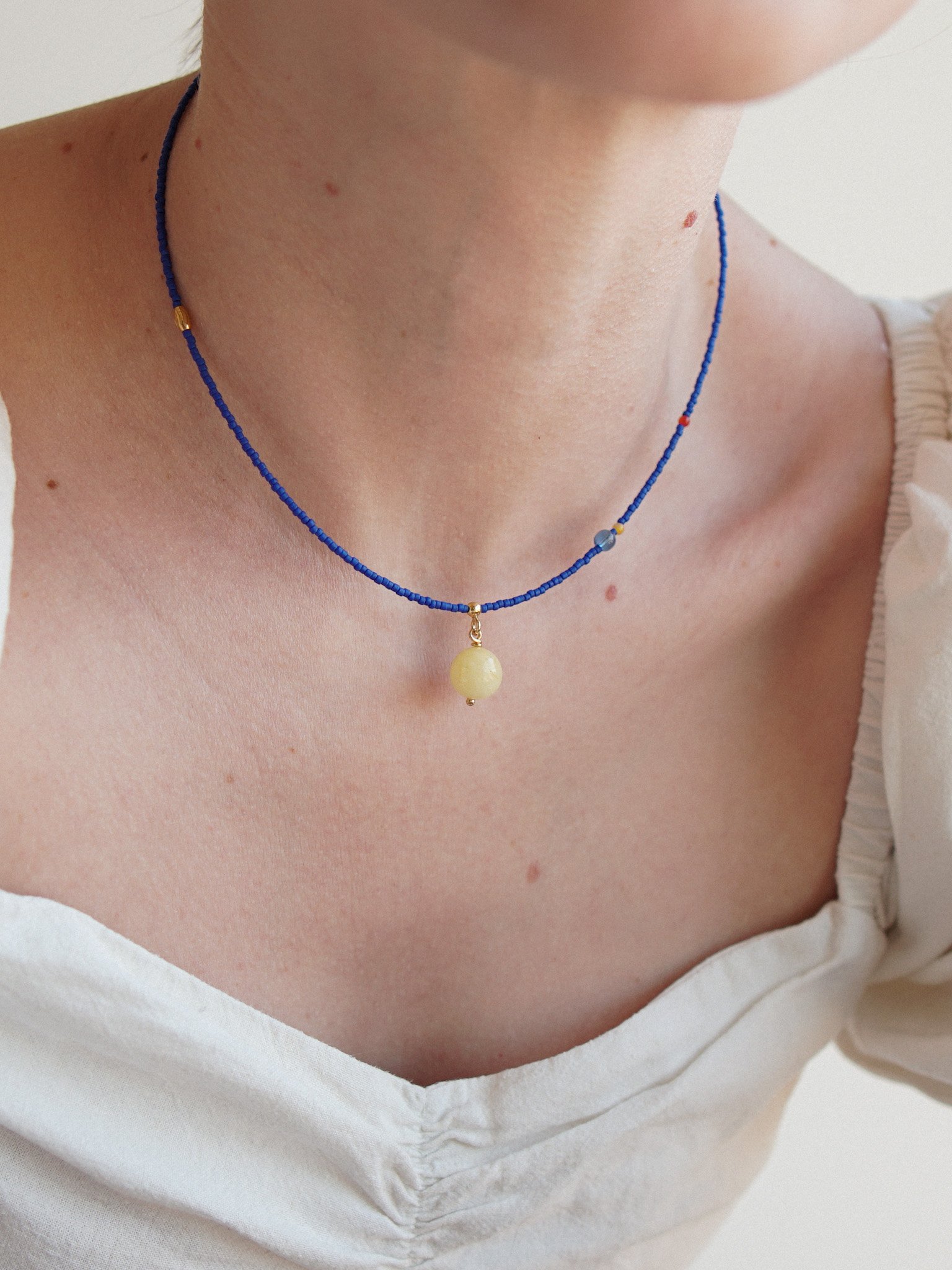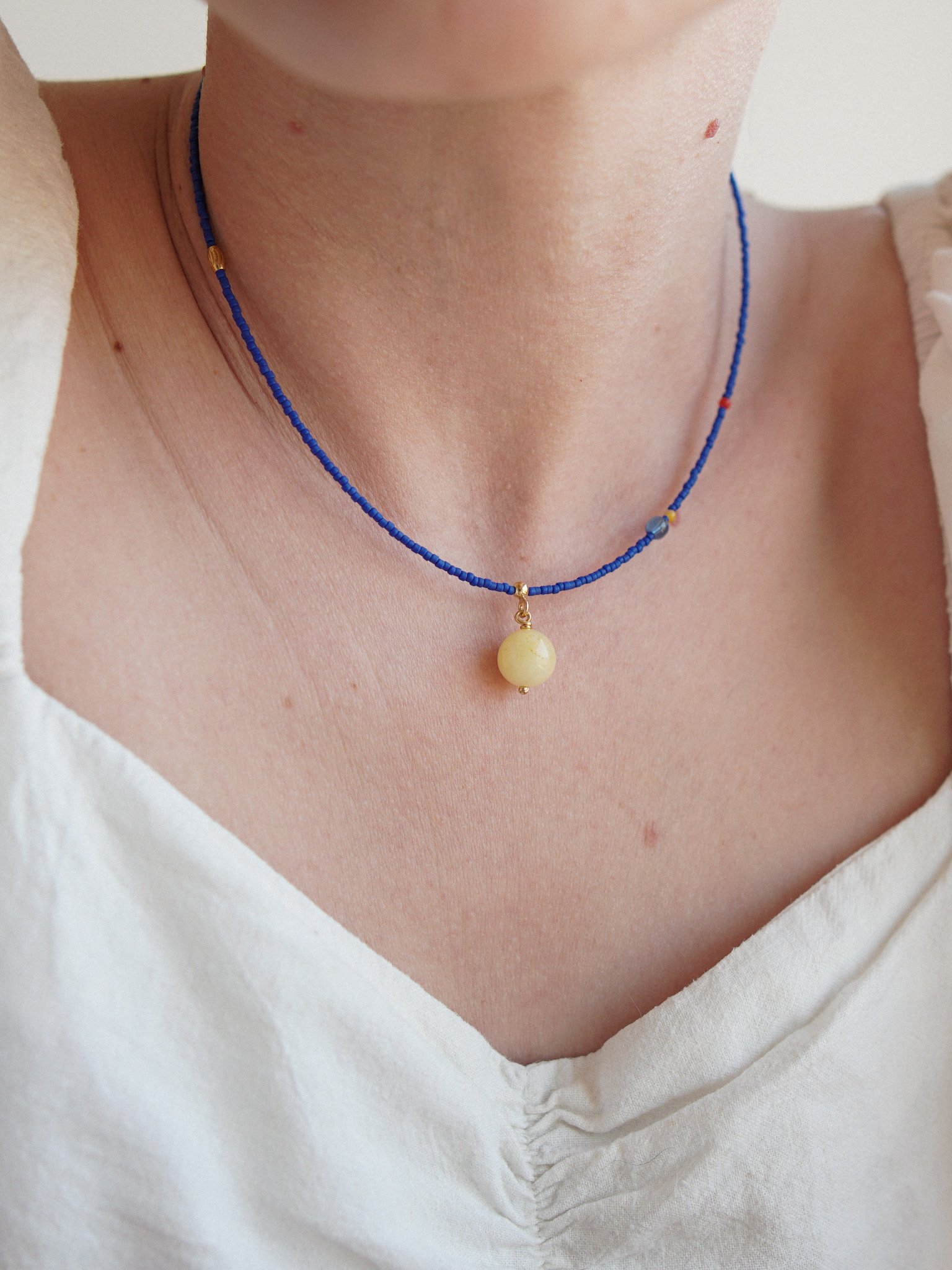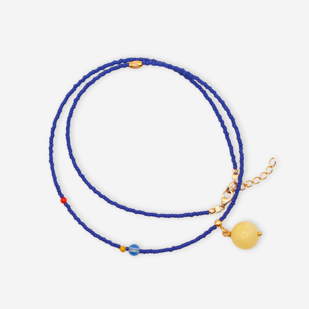 CHABER to soczyście kolorowy naszyjnik wykonany ręcznie z koralików szklanych w kolorze chabrowym, między które powplatane są różne elementy – czerwony i zółty koralik z masy perłowej, frezowany koralik ze stali szlachetnej i niebieski koralik ze szkła. Zawieszka jest wykonana ze srbra pozłacanego 24 K złotem i gładkiego kamienia – zółtego jadeitu. Zapięcie zrobione jest ze srebra pozłacanego 24 K złotem.