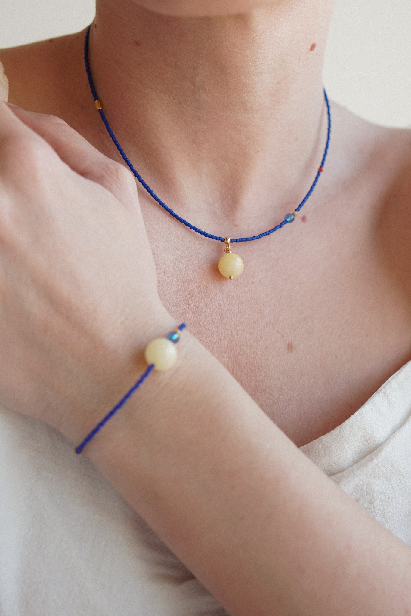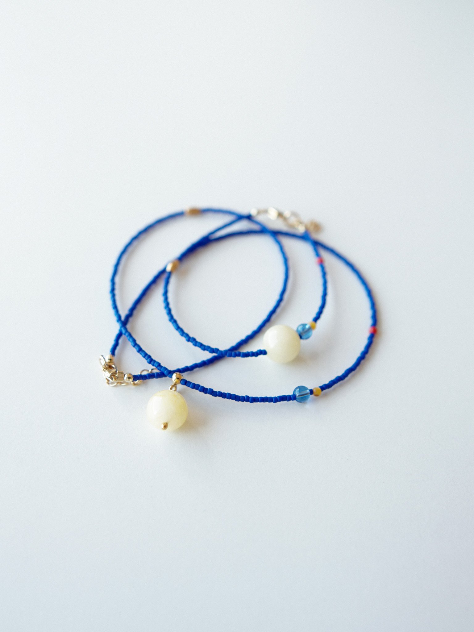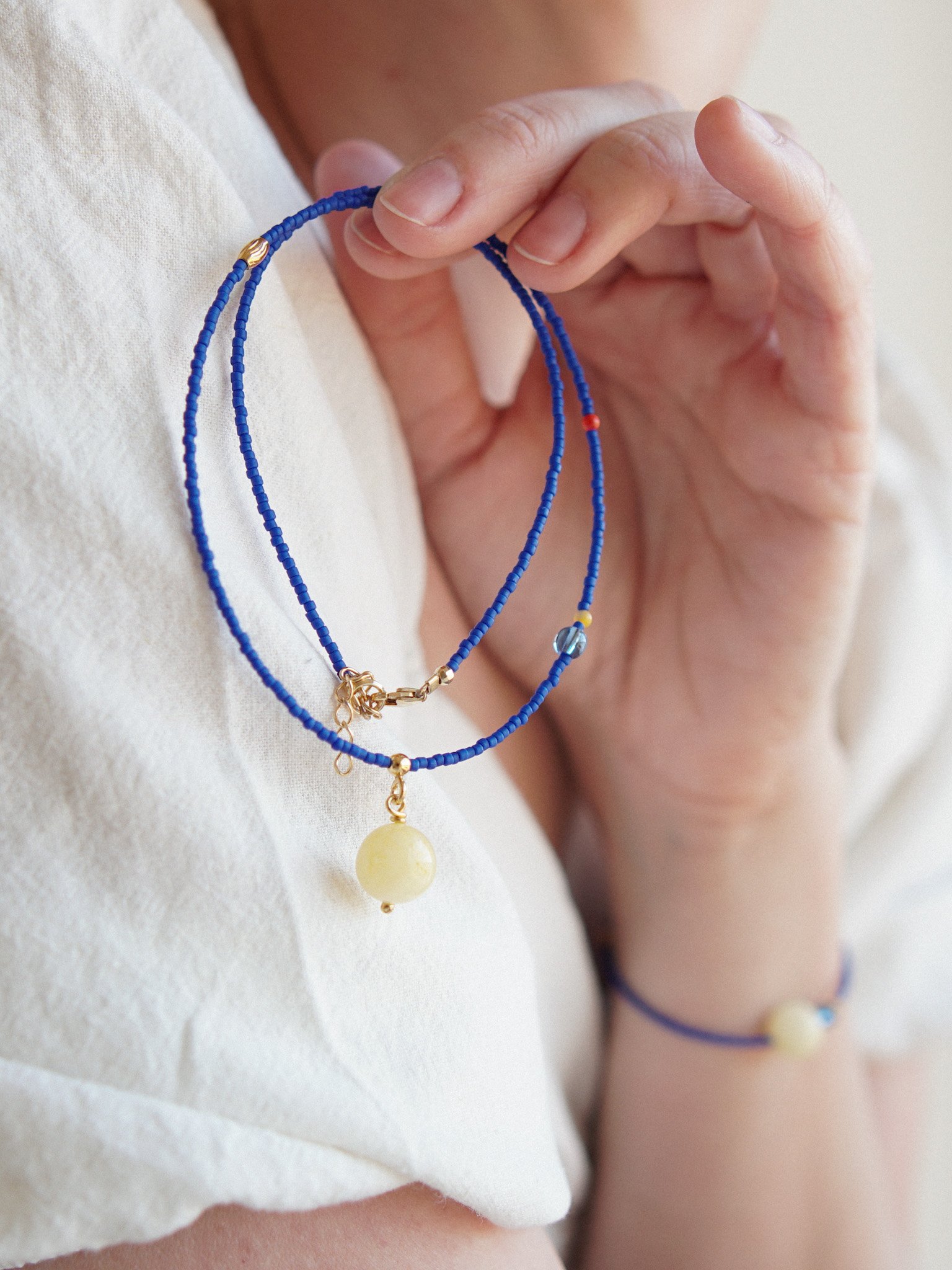 CHABER to soczyście kolorowy naszyjnik wykonany ręcznie z koralików szklanych w kolorze chabrowym, między które powplatane są różne elementy – czerwony i zółty koralik z masy perłowej, frezowany koralik ze stali szlachetnej i niebieski koralik ze szkła. Zawieszka jest wykonana ze srbra pozłacanego 24 K złotem i gładkiego kamienia – zółtego jadeitu. Zapięcie zrobione jest ze srebra pozłacanego 24 K złotem.