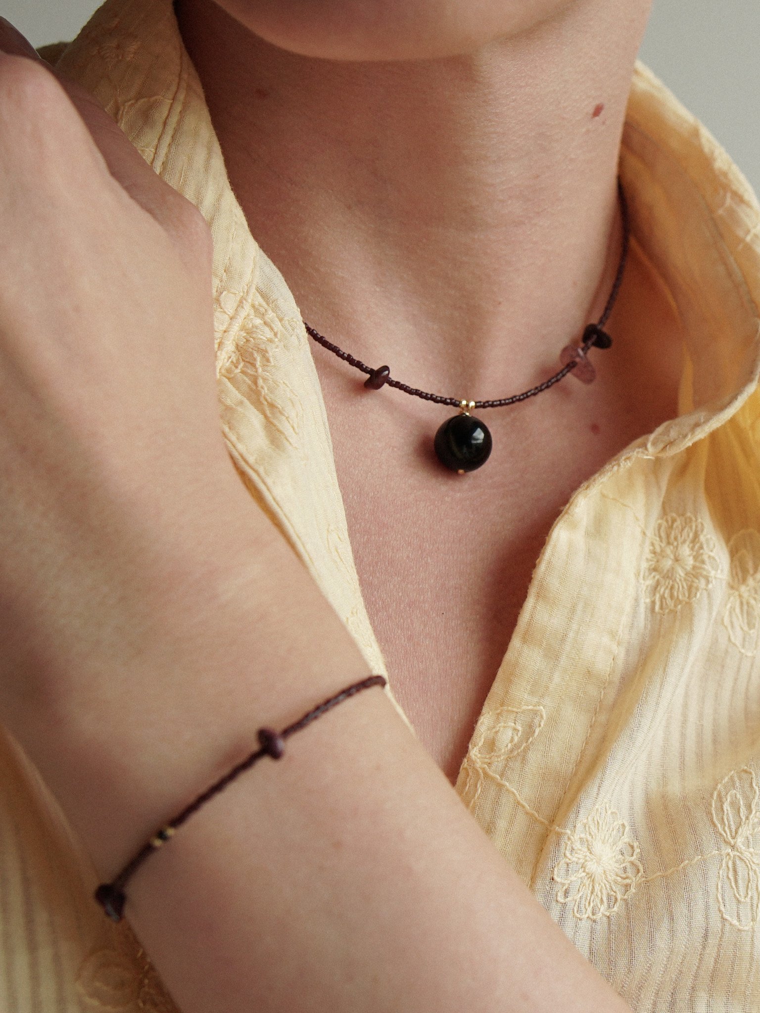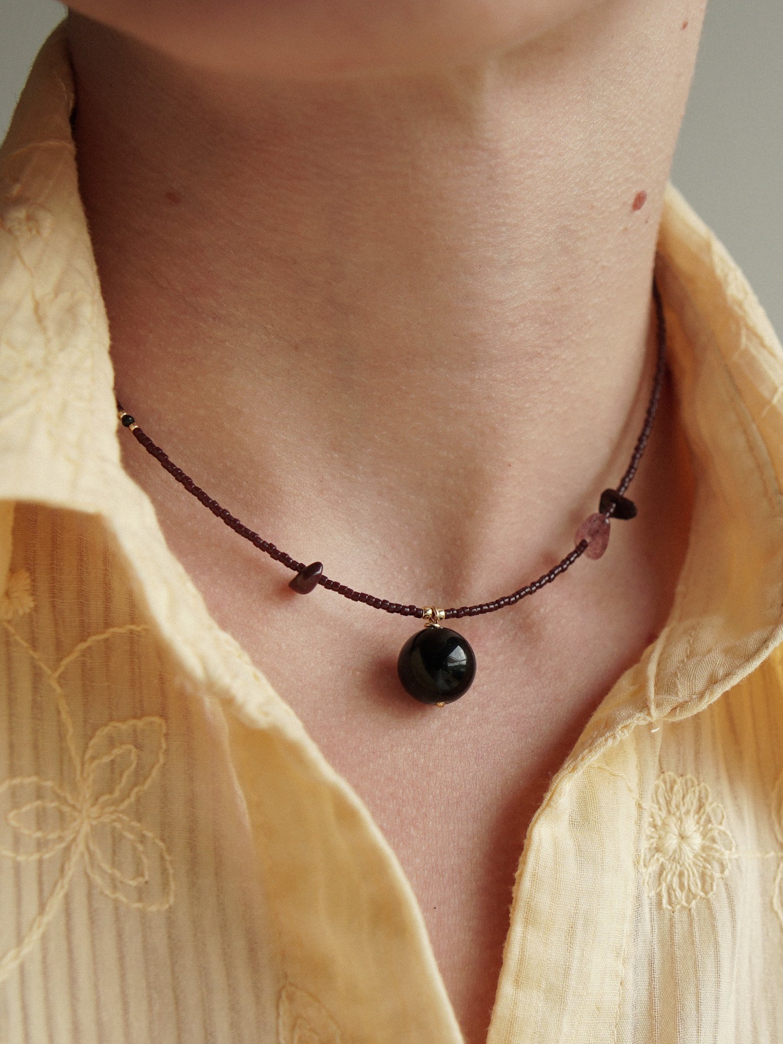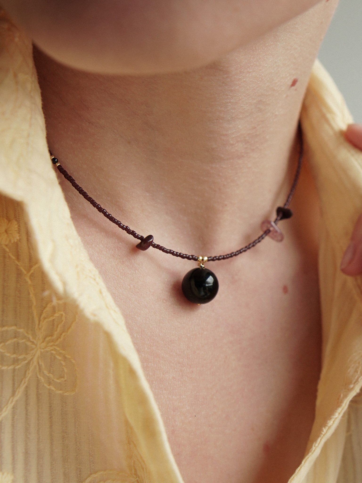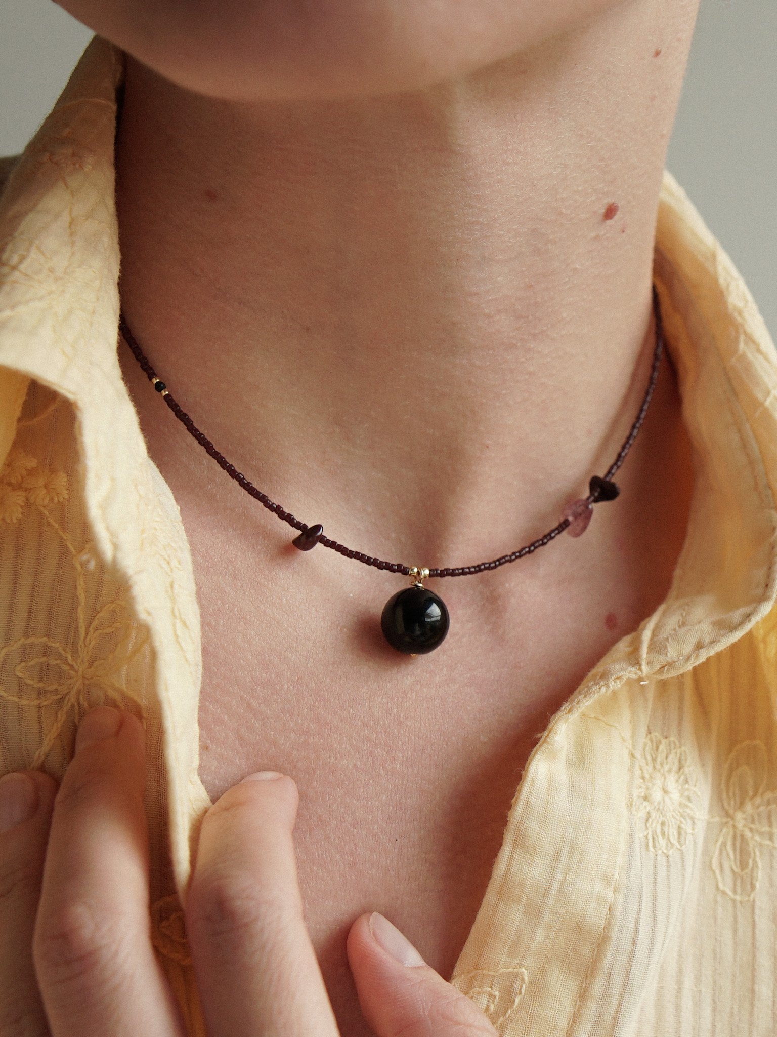 CZARNA PORZECZKA to naszyjnik wykonany ręcznie z drobnych koralików szklanych w ciemnym bordowym kolorze. W koraliki fantazyjnie są wplecione minerały – malutki, czarny, fasetowany spinel, a także nieregularne bordowe jaspisy i kwarc truskawkowy. Zawieszka to kulka czarnego agatu. Naszyjnik posiada zapięcie ze srebra pozłacanego wraz z przedłużką do regulacji długości.