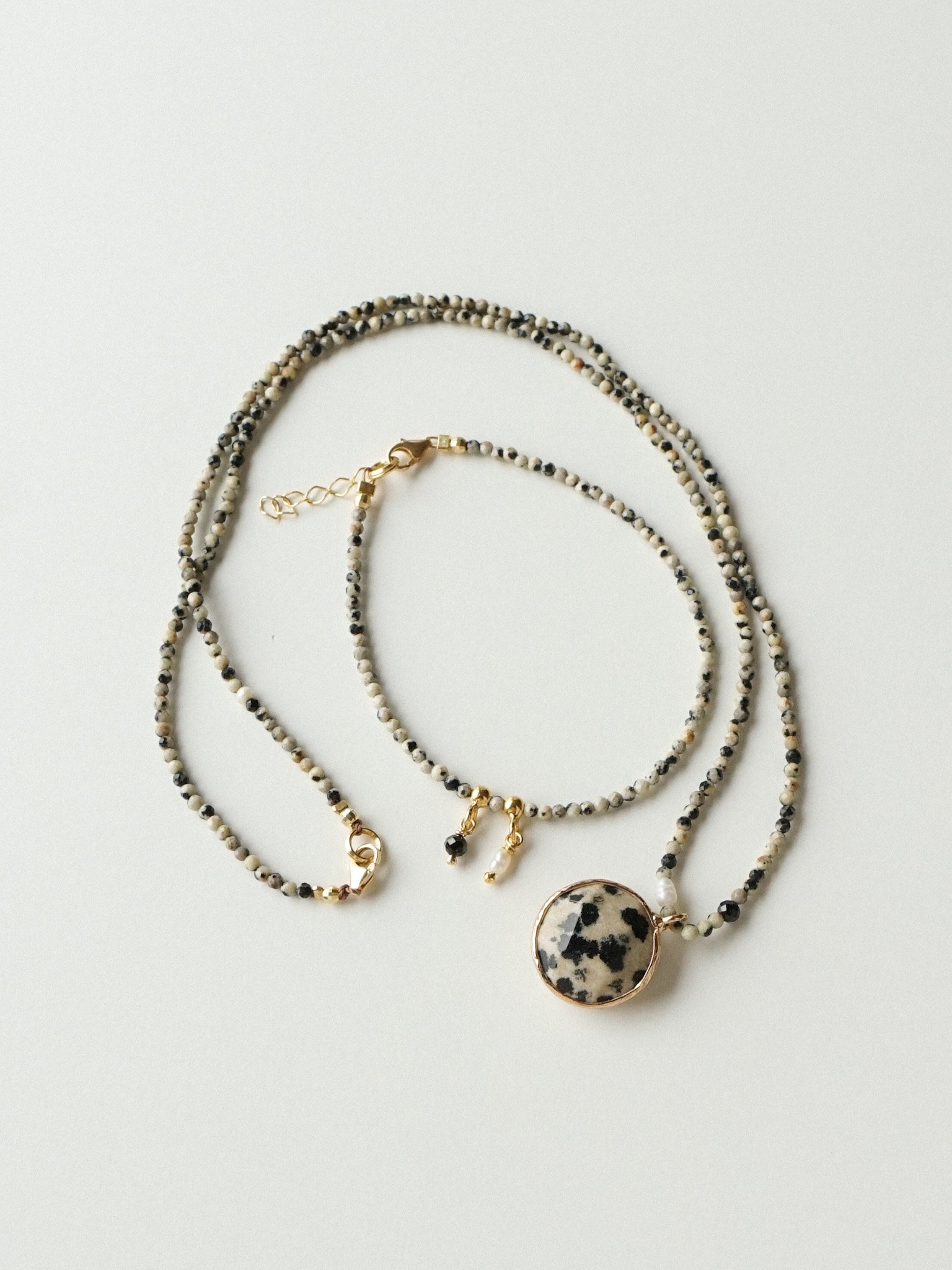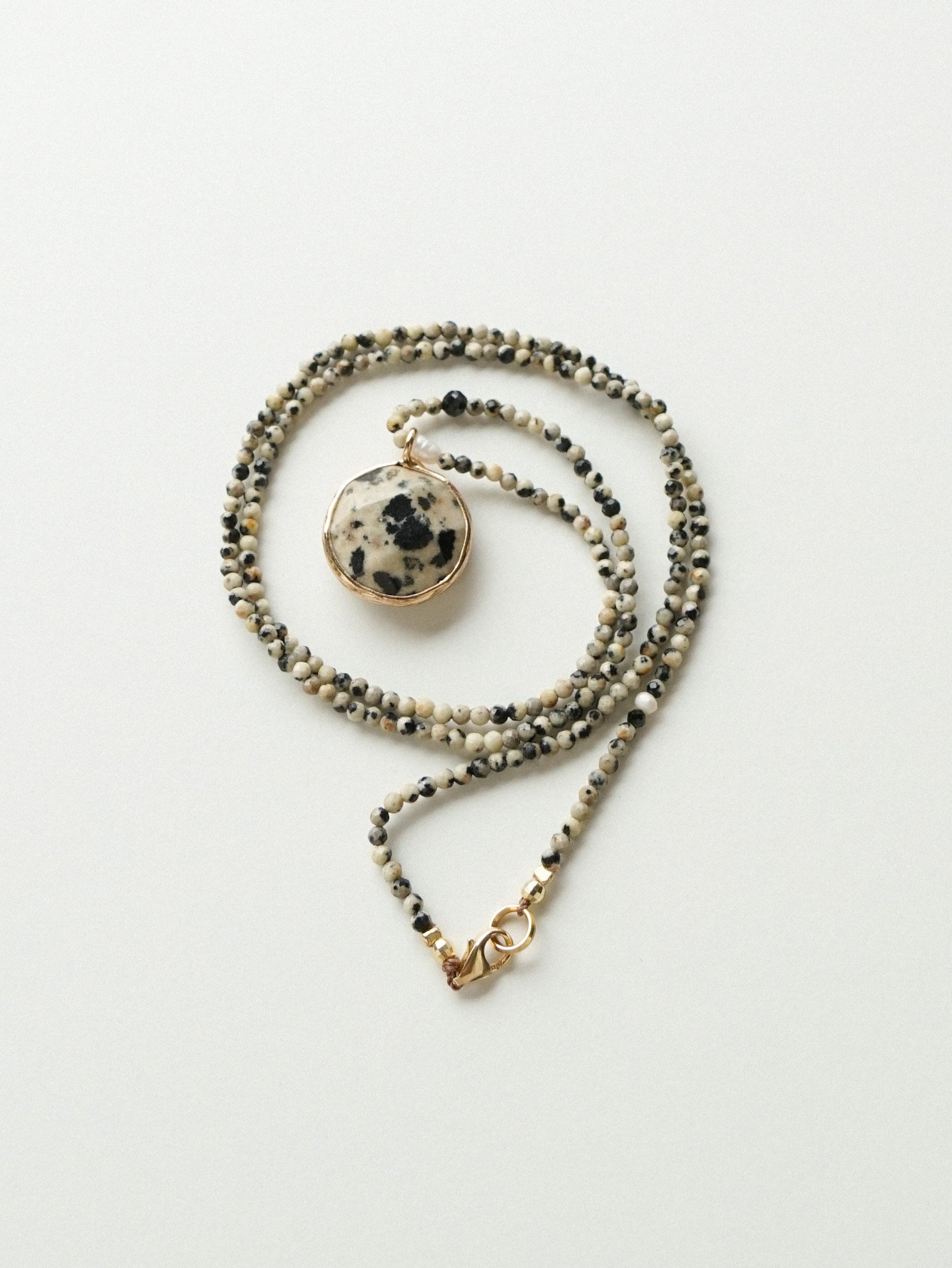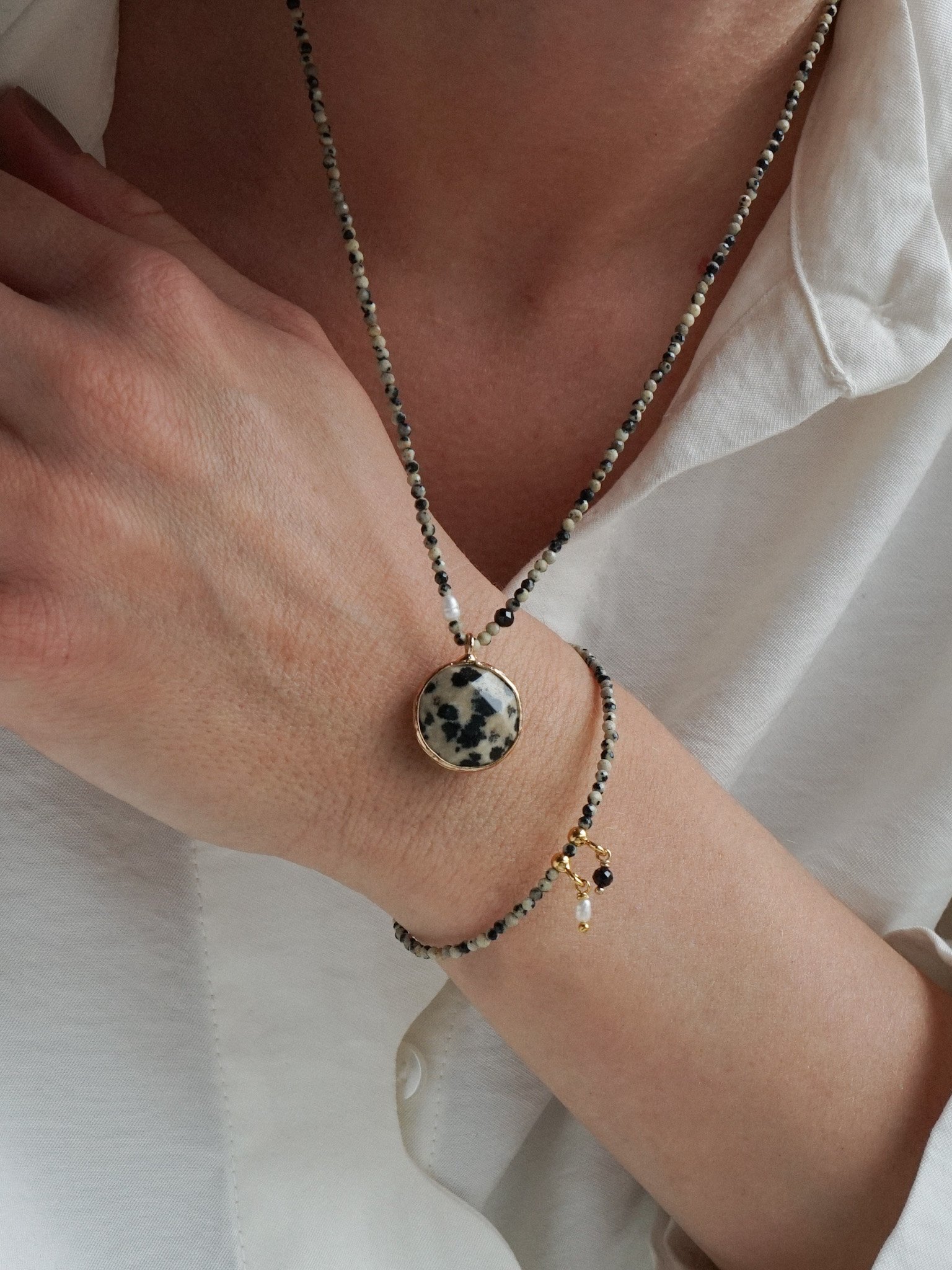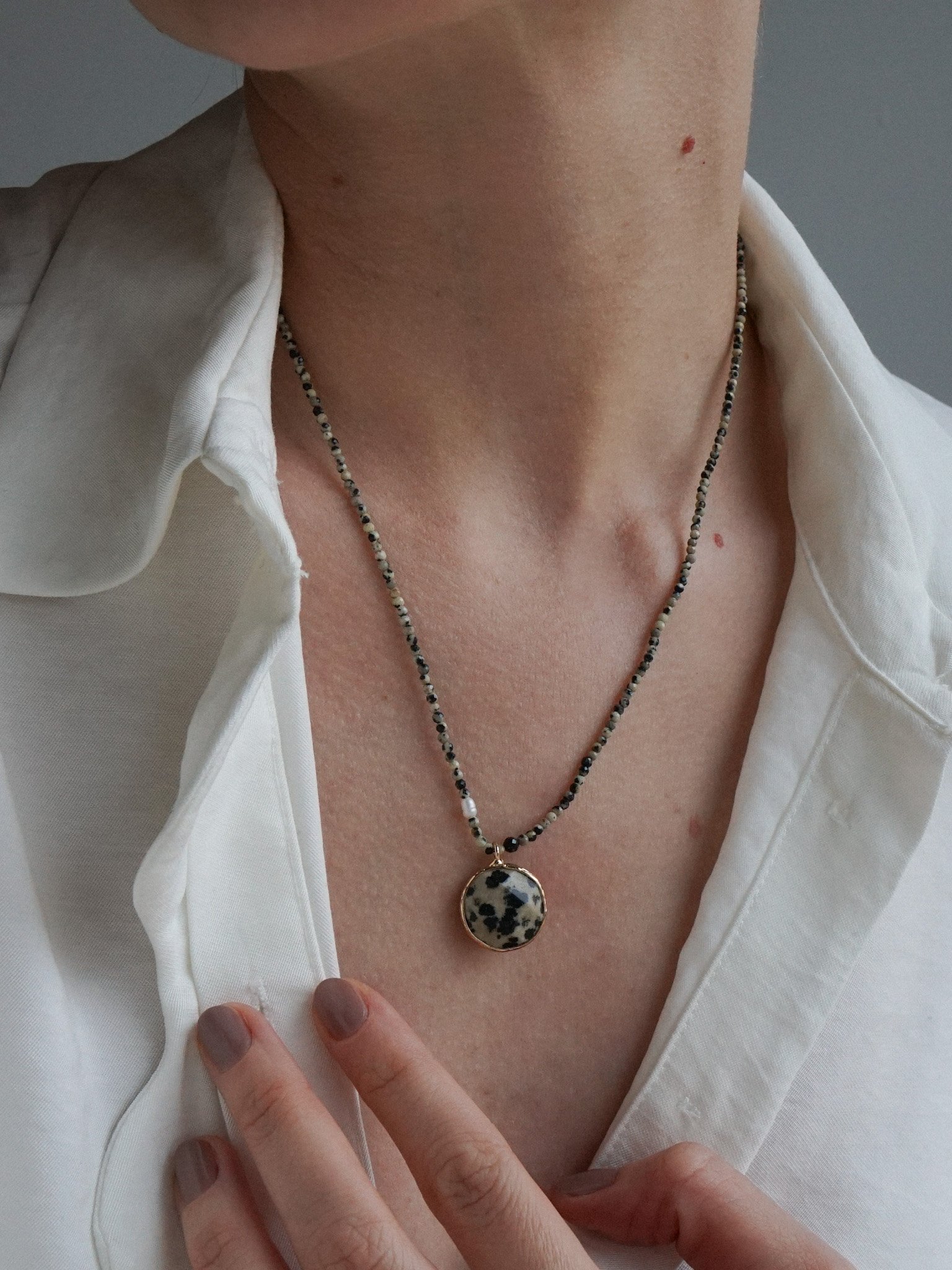 GEPARD to naszyjnik wykonany ręcznie z drobnych pięknych, fasetowanych jaspisówdwóch niewielkich białych pereł i dwóch czarnych spineli. Posiada zawieszkę w postaci fasetowanego, okrągłego jaspisu w okuciu. Naszyjnik ma zapięcie ze srebra pozłacanego.