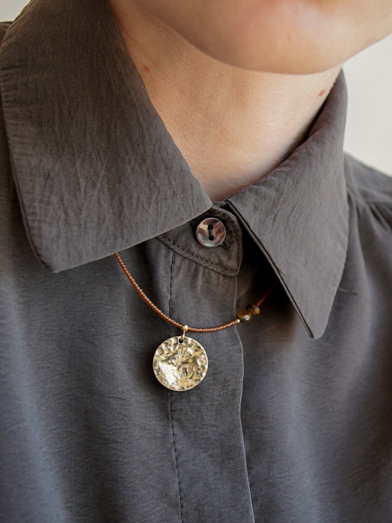METEOR to naszyjnik wykonany ręcznie. W drobne brązowe koraliki ze szkła są wplecione mieniące się kamienie tygrysie oko i koraliki srebra pozłacanego. Naszyjnik posiada zapięcie ze srebra pozłacanego wraz z przedłużką do regulacji długości. Z tym naszyjnikiem możesz stworzyć komplet z bransoletą o tej samej nazwie.