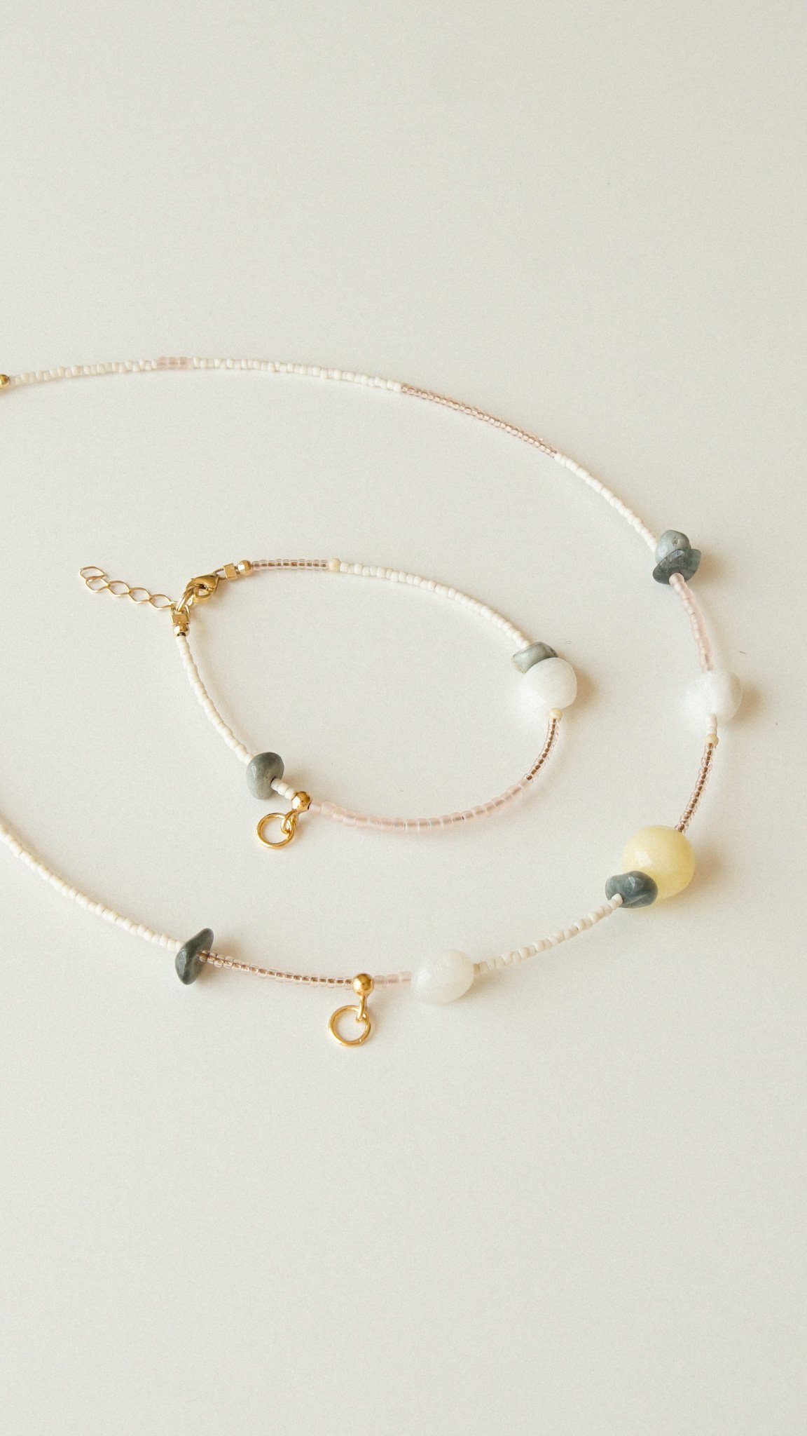 BIAŁE NOCE to naszyjnik wykonany ręcznie z drobnych koralików szklanych w różnych kolorach – kremowym i w odcieniach różu. W koraliki są wplecione minerały – malutki opal, żółta kulka jadeitu, a także nieregularne białe kamienie księzycowe i szare agaty oraz wiszące kółeczko ze srebra pozłacanego. Naszyjnik posiada zapięcie ze srebra pozłacanego wraz z przedłużką do regulacji długości.