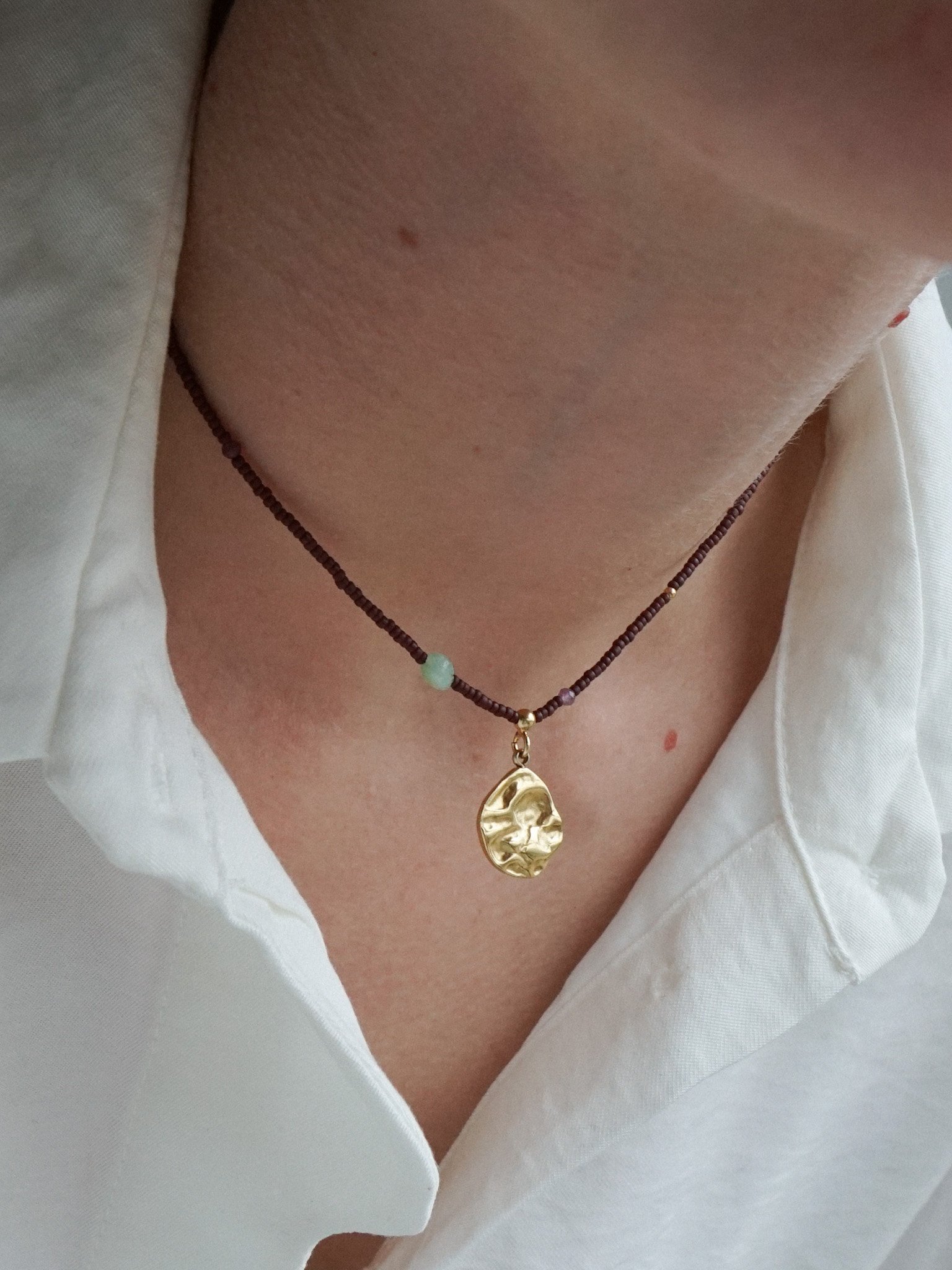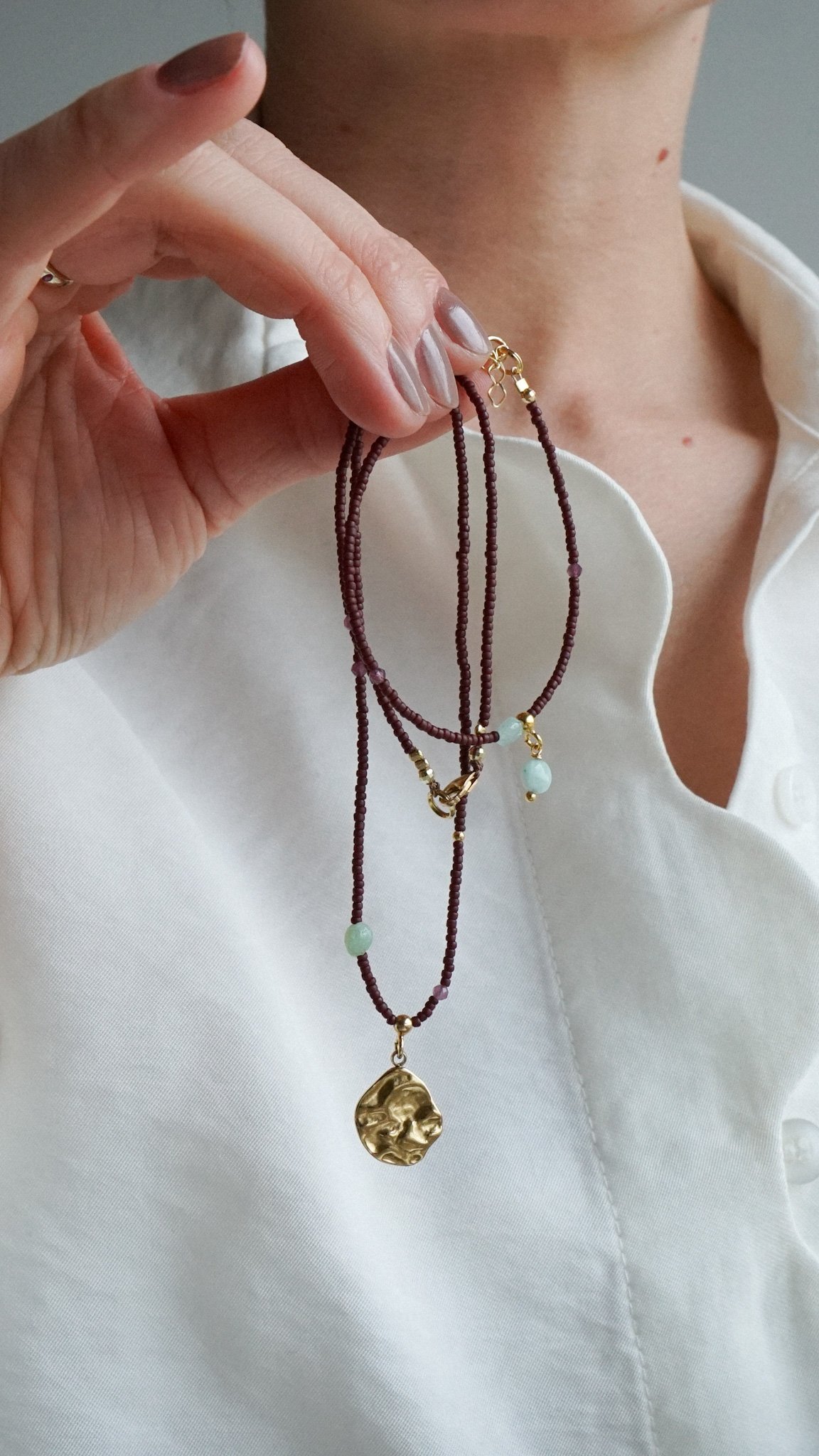 Naszyjnik wykonany ręcznie z drobnych koralików szklanych w kolorze burgundowym. Posiada zawieszkę w postaci nieregularnj, pofalowanej blaszki wykonanej ze stali nierdzewnej. Niewielkie, fasetowane ametysty, podobnie jak amazonit oraz kuleczka srebra pozłacanego są wkomponowane w koraliki szklane. naszyjnik ma zapięcie ze srebra pozłacanego.